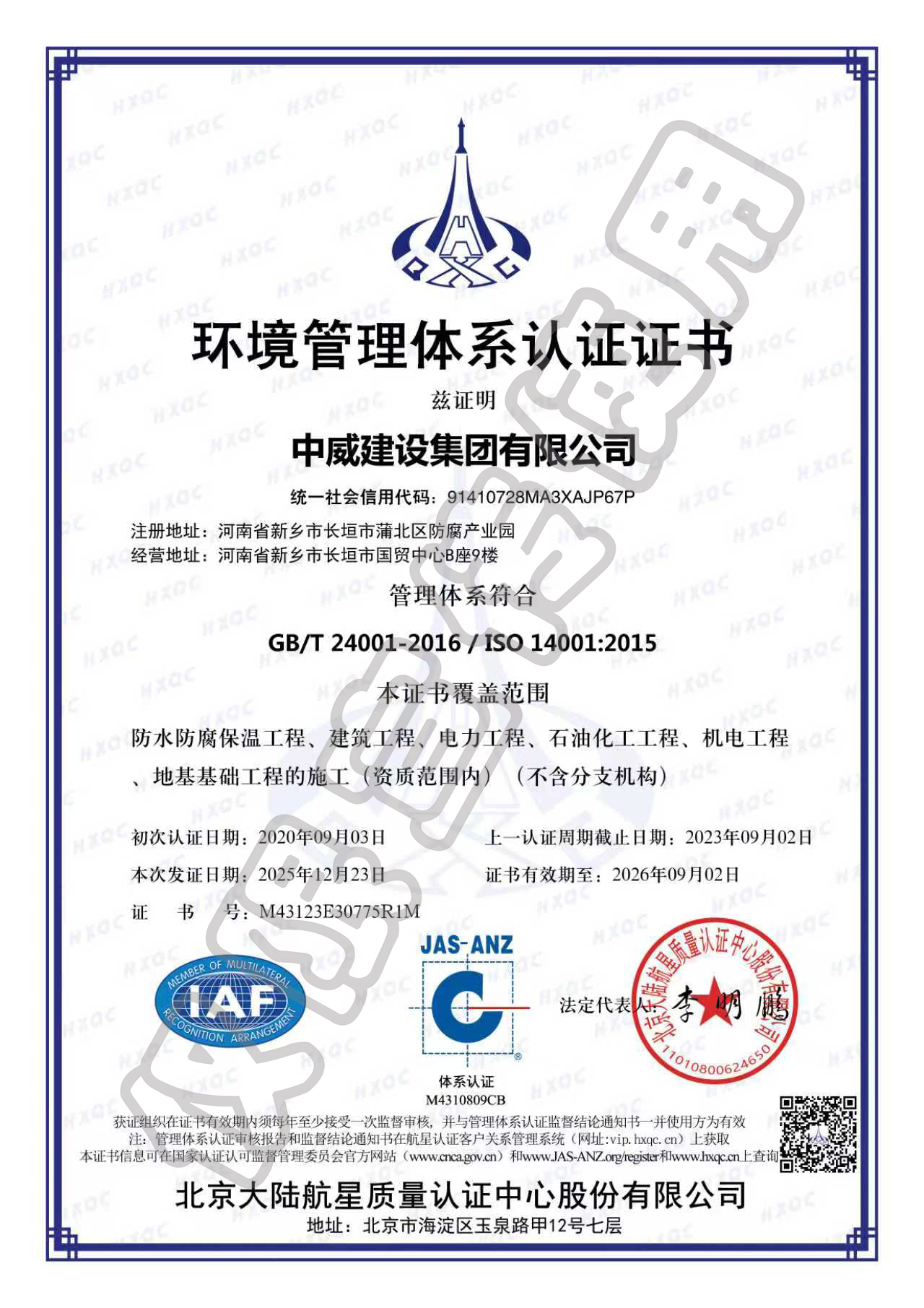 环境管理体系认证证书